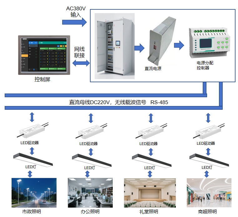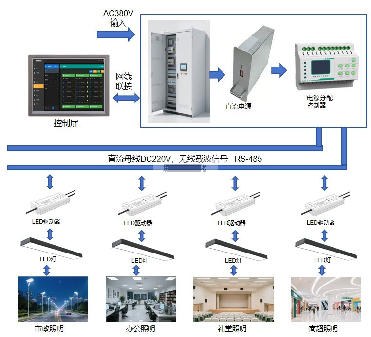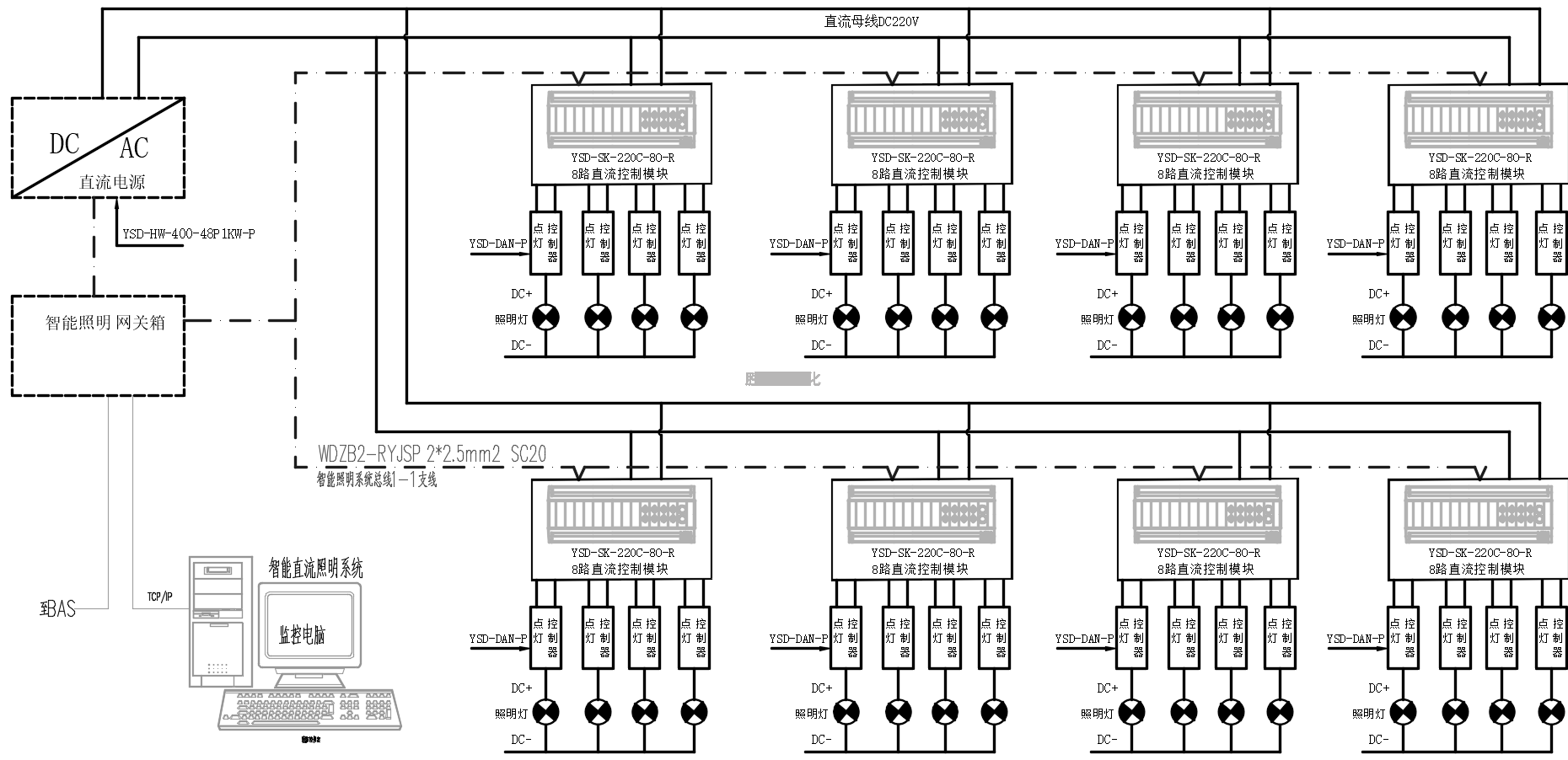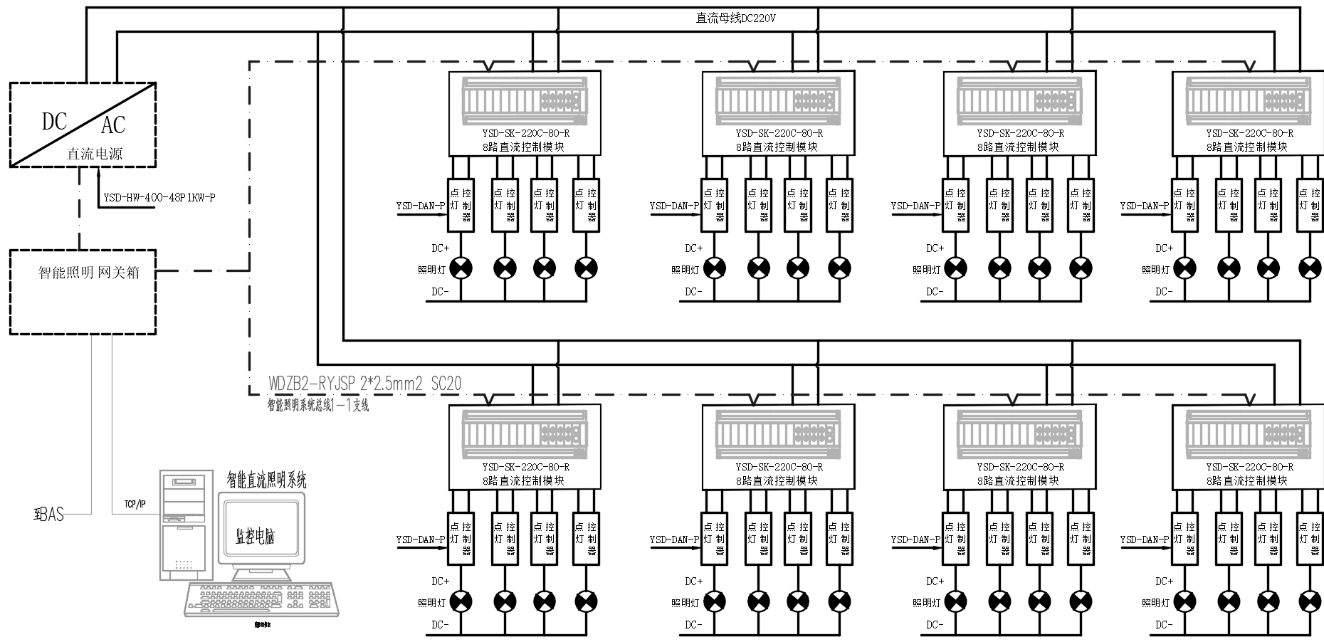 直流电源作为智能电力分配核心设备,采用模块化集成设计,主要由输入输出配电单元、AC/DC 整流模块、智能监控单元、多级交直流防雷组件、回路控制单元及数据通讯模块构成。 采用直流浮地母线供电,防触电,更加安全。 分级控制,按需照明,相比原常规灯,年用电费用节省近2/3,更加节能。远程自动设置与报警、远程诊断维护,提高管理效 率,解决专业管理人员不足的困扰,更加智能。用无级智慧调光机制,二次节能,直流供电,杜绝频闪,绿色护眼。N+1模块冗余备份、毫安级支路绝缘检测,保证系统安全可靠,无级智慧调光机制,在节能的同时更加护眼。 延长灯具使用寿命,降低运维成本。直流母线载波通信,无需单独敷设通讯线,大幅降低施工难度及管线成本,缩短施工周期。单回路调光,控制简单方便。
